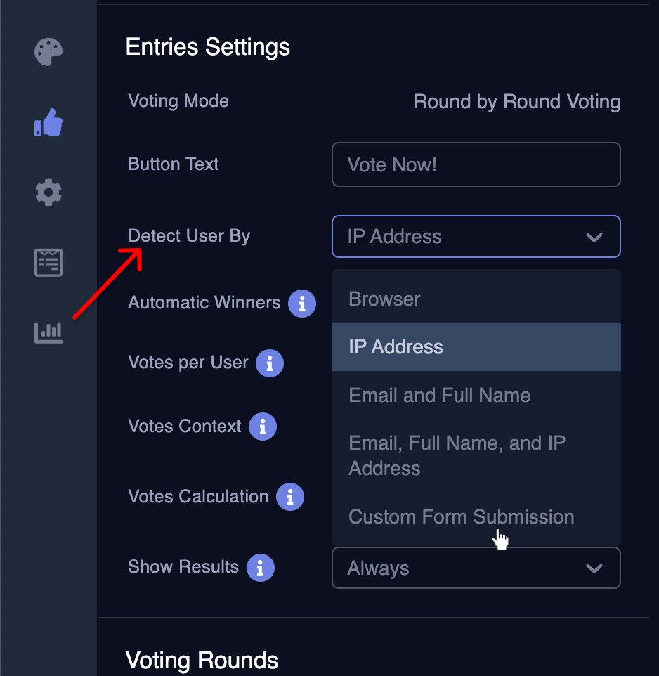 The "Custom Form Submission" feature in the bracket widget is a handy tool that ensures fair voting or predictions by preventing users from voting multiple times. This feature employs custom validation methods based on your chosen parameter, providing you with the flexibility to prevent double votes.