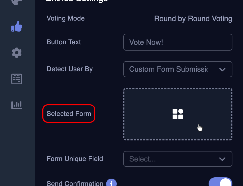 - A new option named Selected Form will appear. Click on the Widget Selection to choose the specific form users must complete before submitting their vote or prediction. Then, click on the Select widget button.