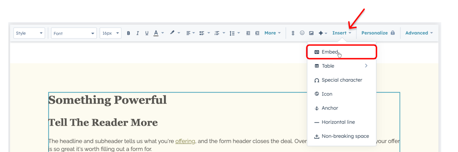 - In the Rich Text element, click on the Insert option, then select Embed.
