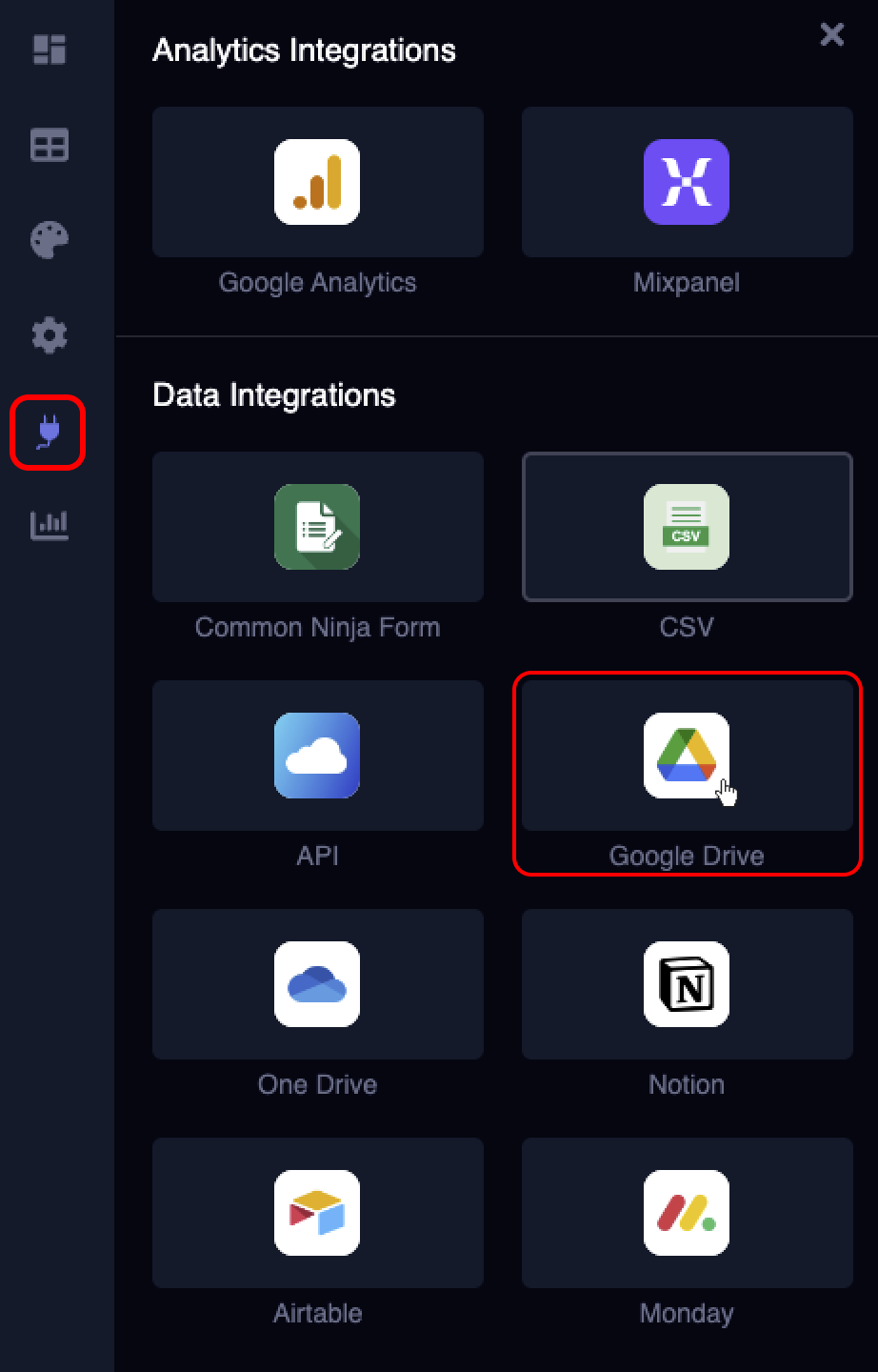 The Google Drive integration allows you to easily import data from CSV files stored within your Google Drive, and use this data across various widgets.