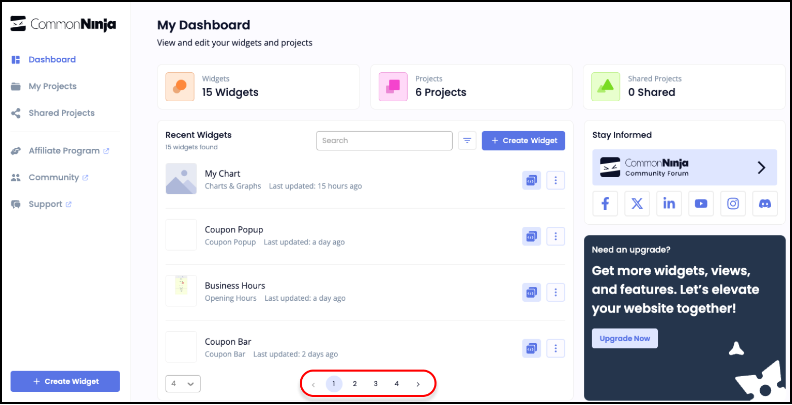 If you have many widgets, they might be spread across multiple pages. Pagination controls at the bottom of the dashboard allow you to navigate through these pages easily. Use the forward and backward arrows or specific page numbers to jump directly to the page containing the widget you need.