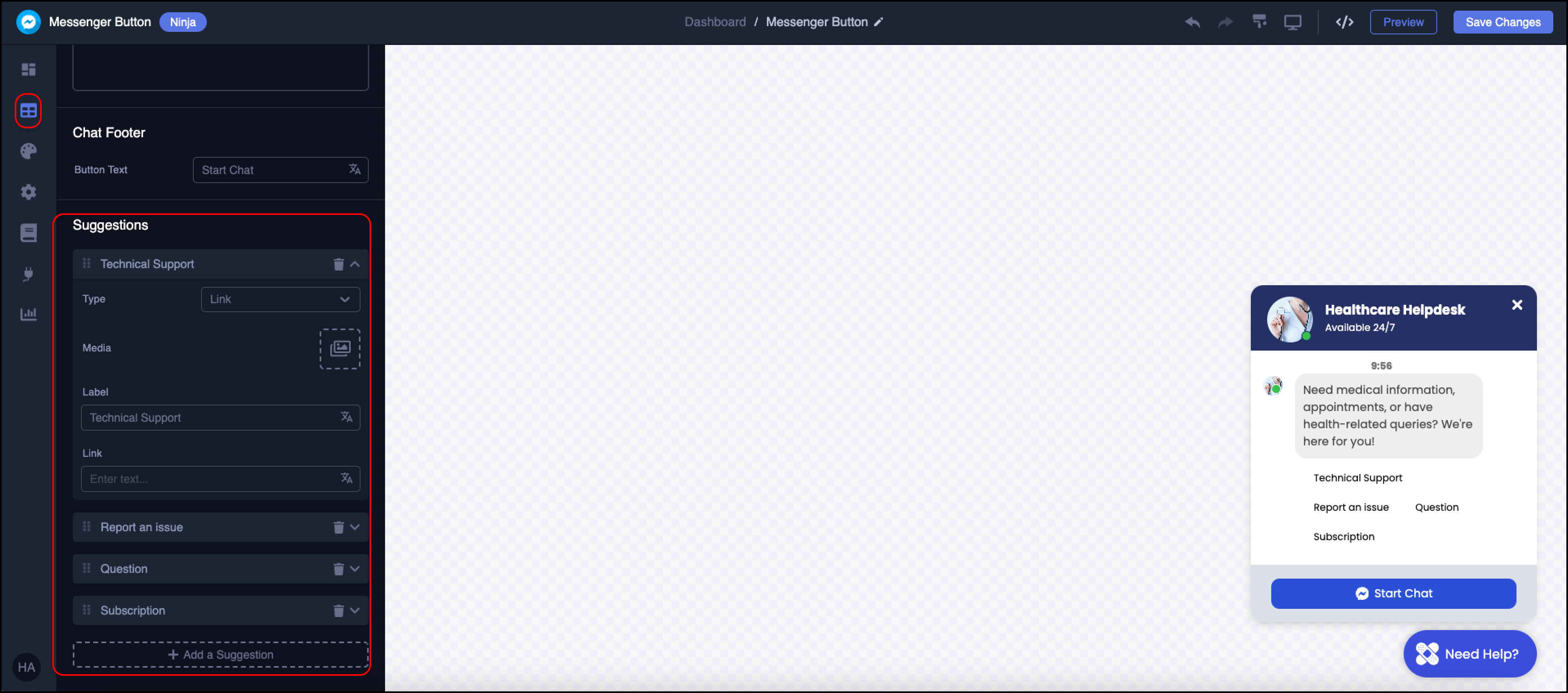 - In the editor of your Messenger Chat widget, navigate to "Content" on the left menu bar and scroll down to "Suggestions."