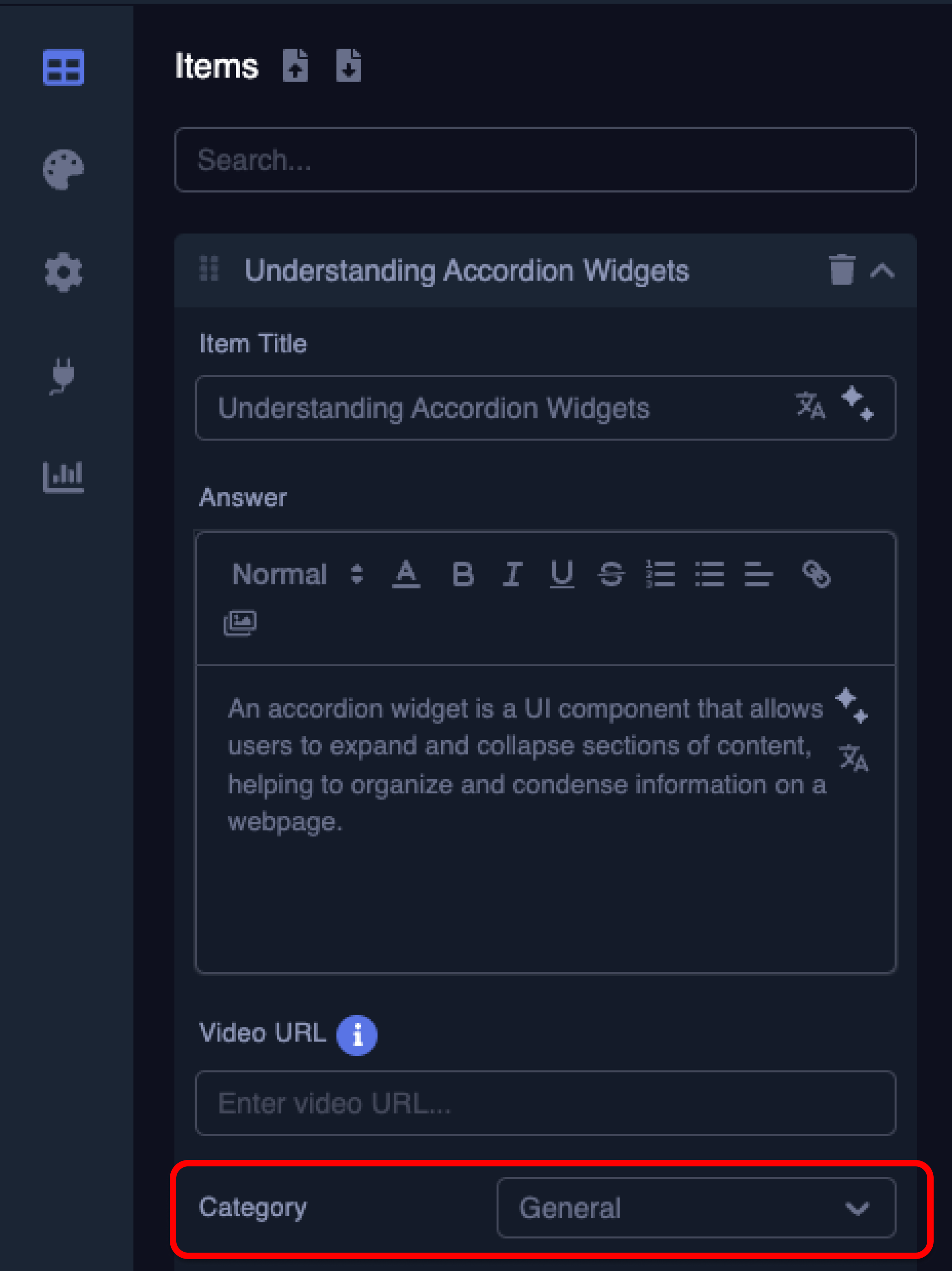 Using categories is a great method for organizing your items, allowing users to easily find answers within the Accordion Widget