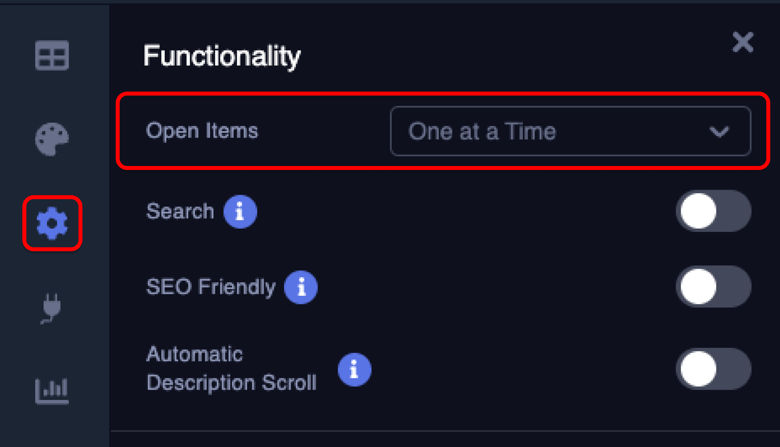 You can customize the opening behavior of your items according to your preferences. Whether you prefer them opening individually, one at a time, with others closing automatically, or as a group where multiple items can be open simultaneously, or even have all items open at all times, you can easily adjust these settings.