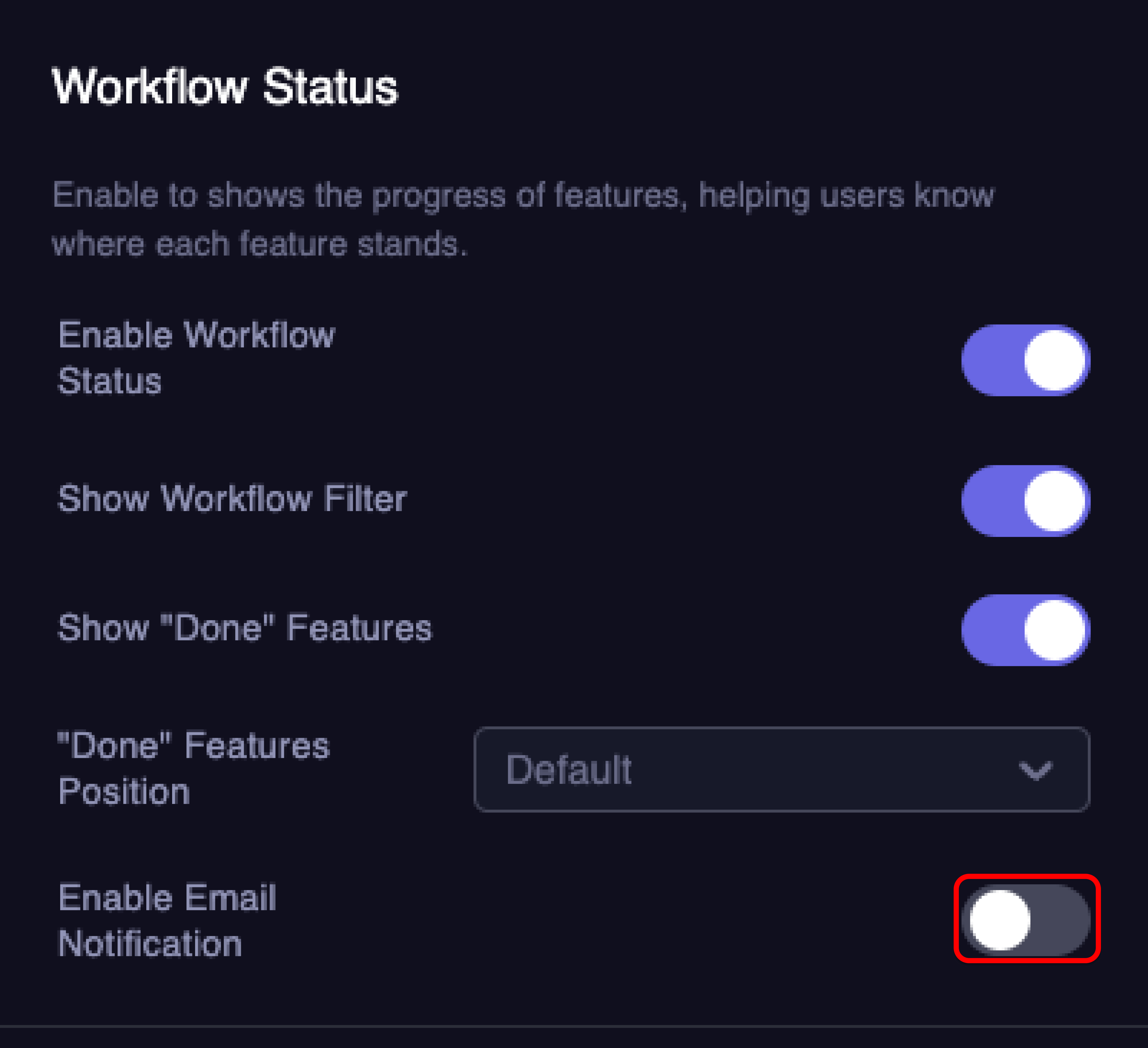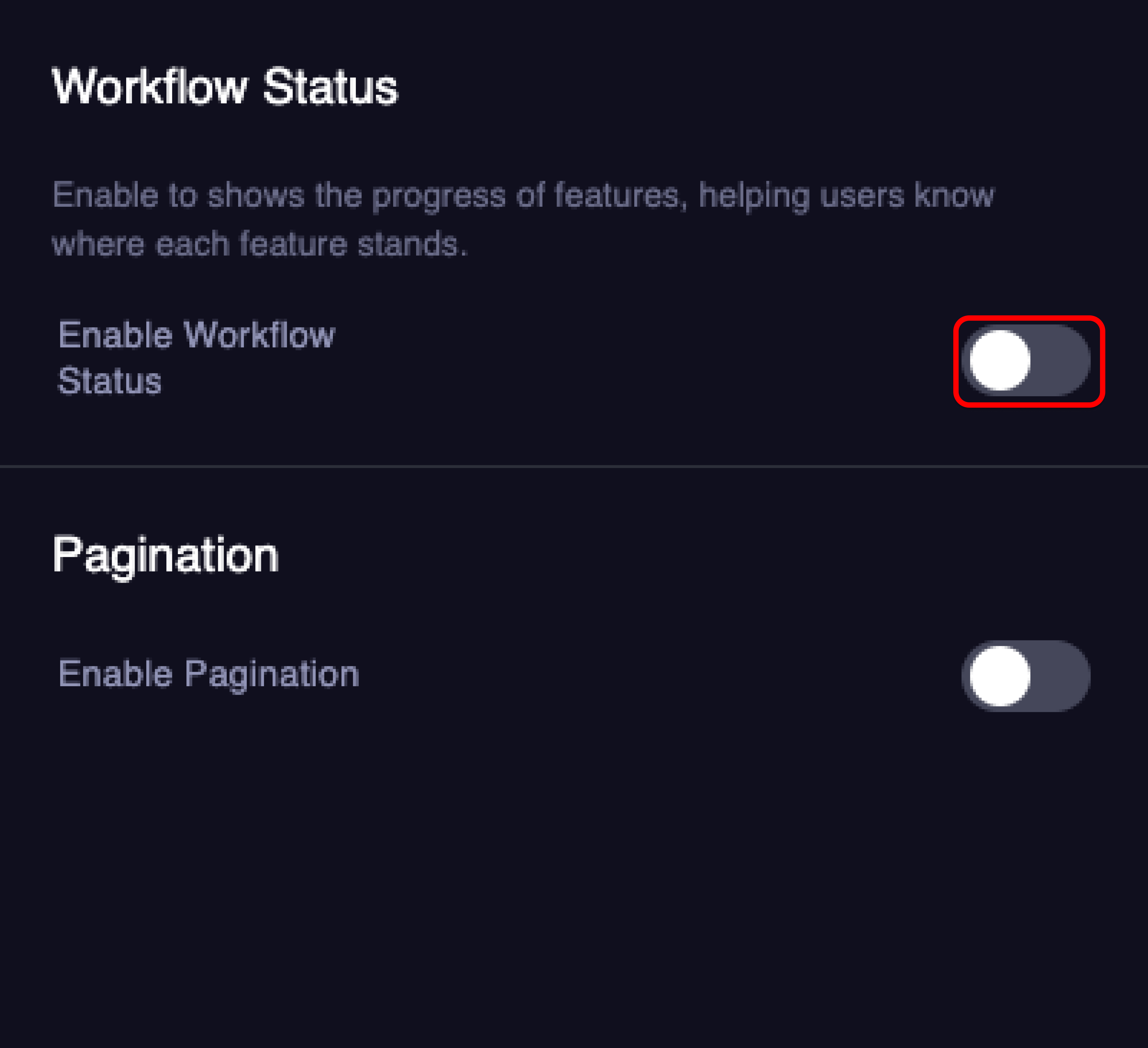 - Toggle the Enable Workflow Status option to activate the feature workflow settings.