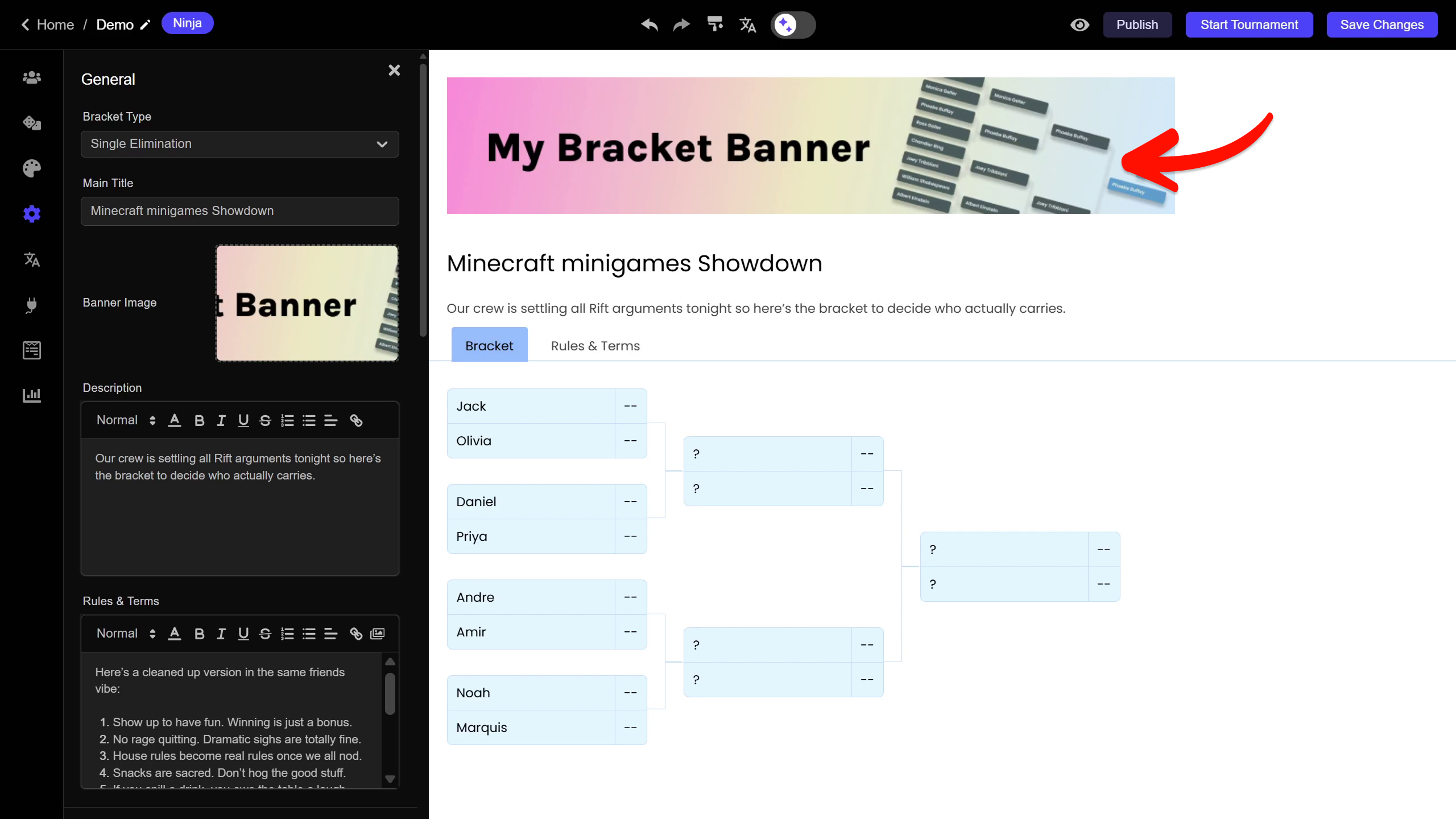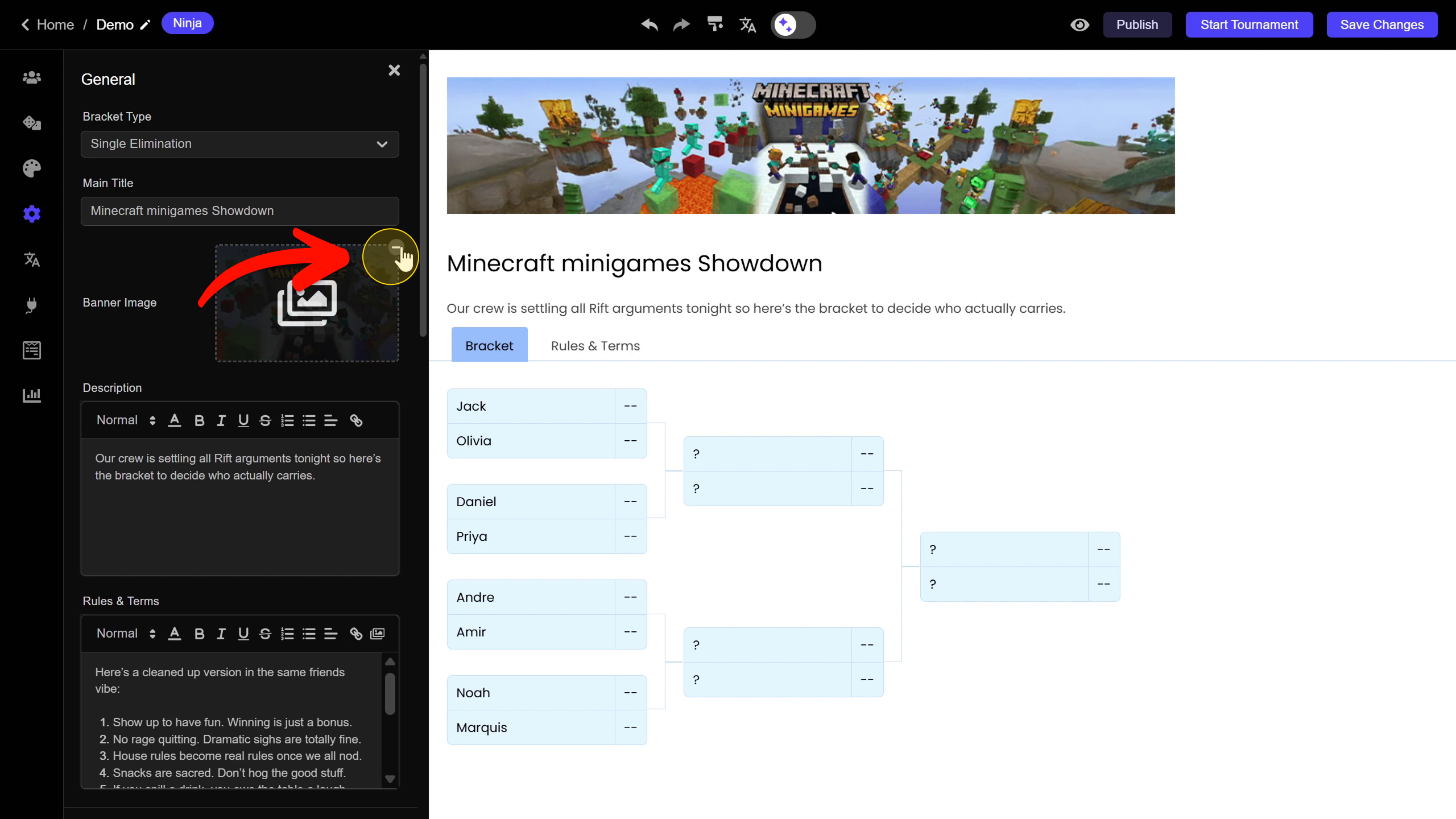 You can customize the banner shown at the top of your bracket directly from the editor settings. The banner’s default display height is 150px.