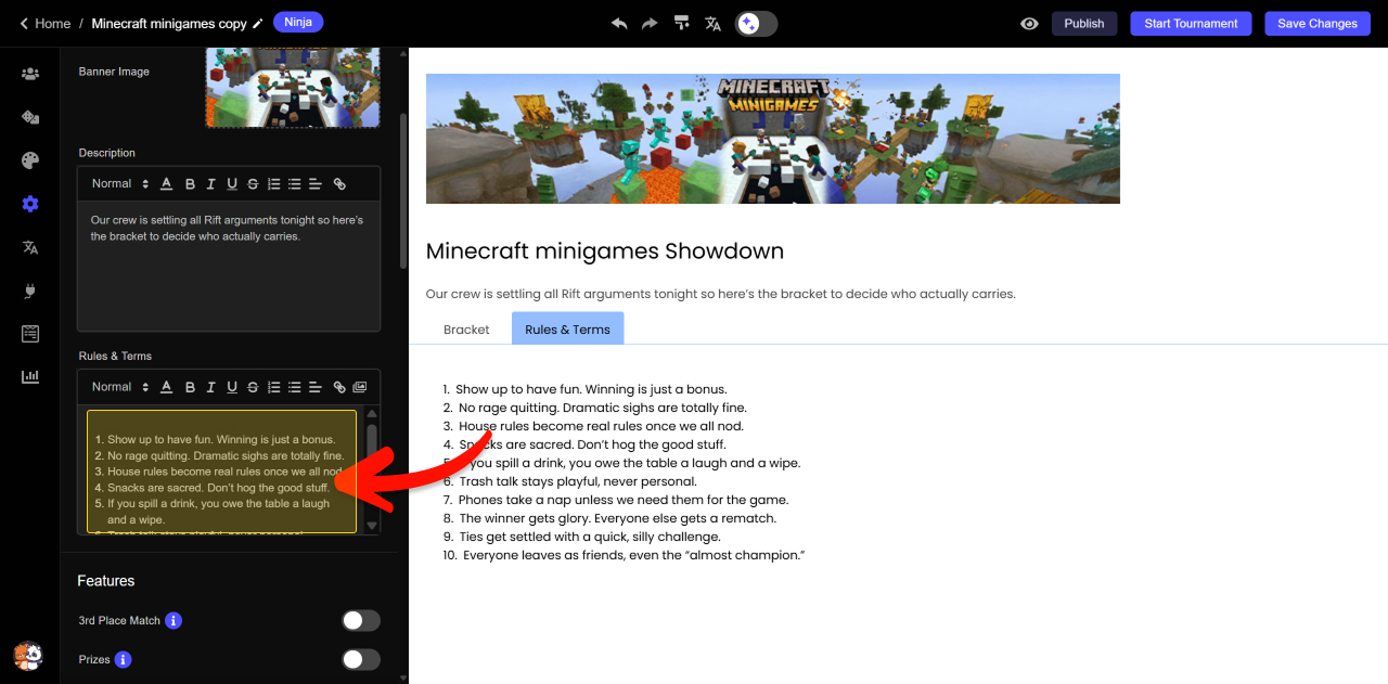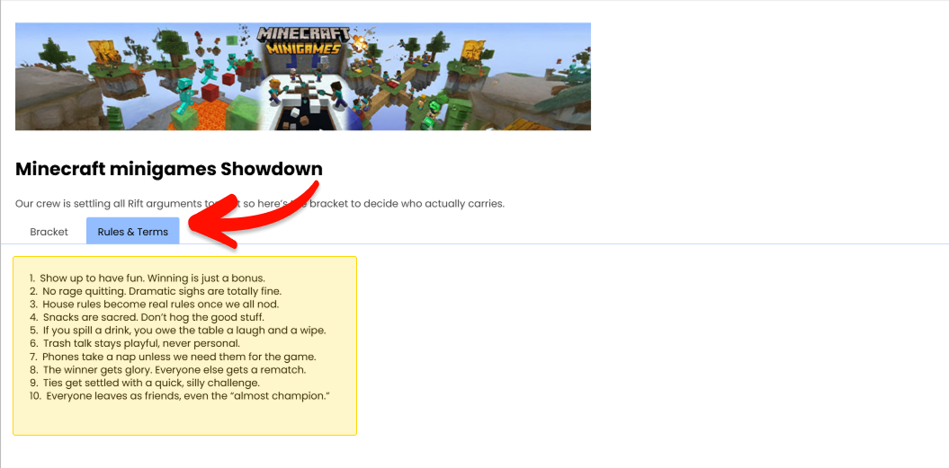 When enabled, the Rules tab displays whatever text you add in the Rules & Terms textbox inside the bracket settings. This can include things like: