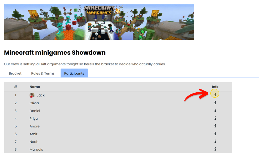 The Participants table is an optional tab in your bracket that displays a clean list of everyone in the tournament. It helps visitors quickly see all participants in one place, along with their basic details, without scrolling through the bracket itself.
