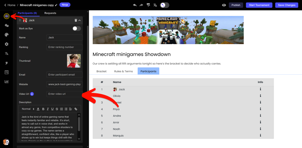 Edit any participant details (name, thumbnail, description, links, etc.).