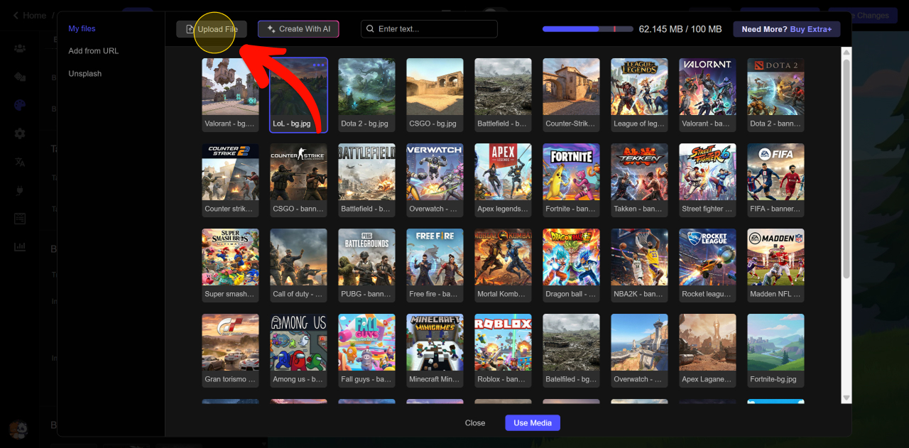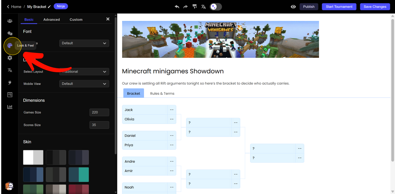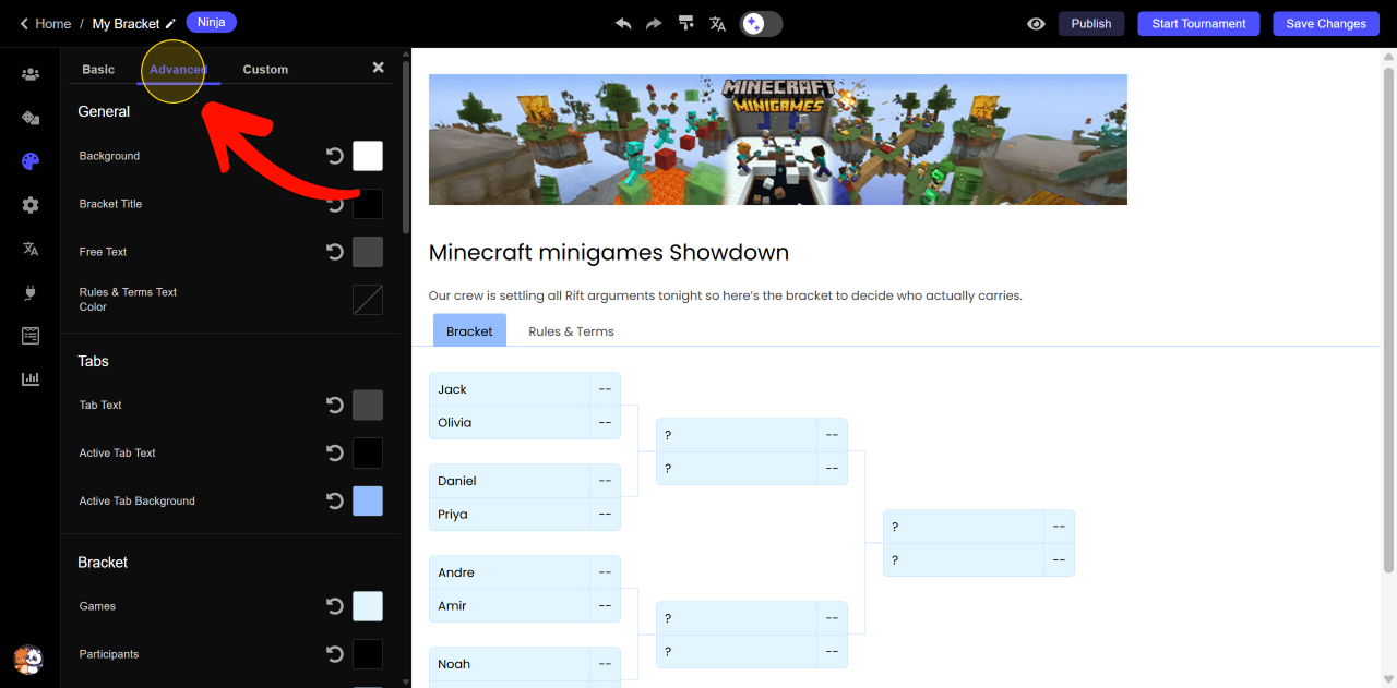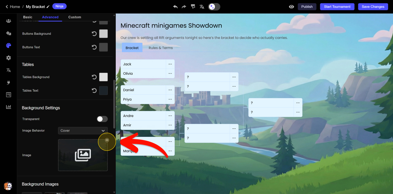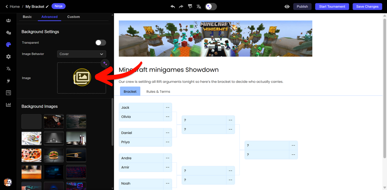 A background image lets you place a visual behind your bracket, helping match your tournament to a theme, game, or brand. You can add, replace, or remove the background anytime from the editor.