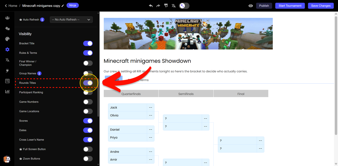 Round titles are the labels shown above each stage of your bracket, like “Quarterfinals,” “Semifinals,” and “Final.” They help visitors understand the tournament flow and make it easier to follow progress at a glance. You can choose to display or hide these titles, and you can rename them to match your event or theme.