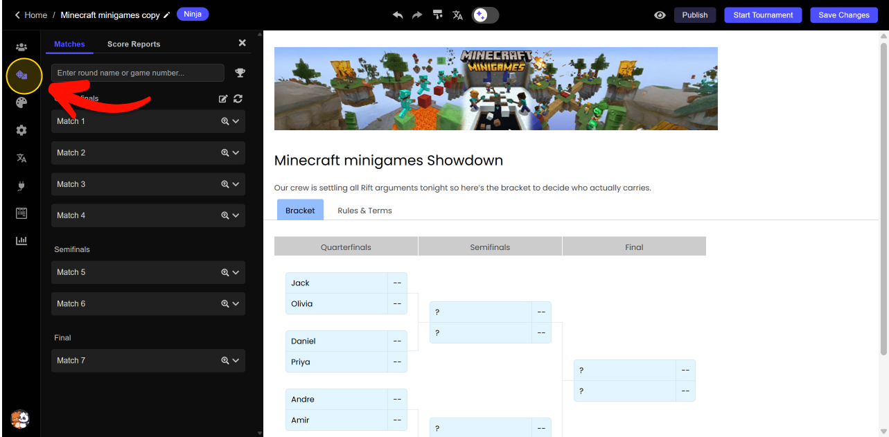 In the left sidebar, click Matches (matches/bracket icon).