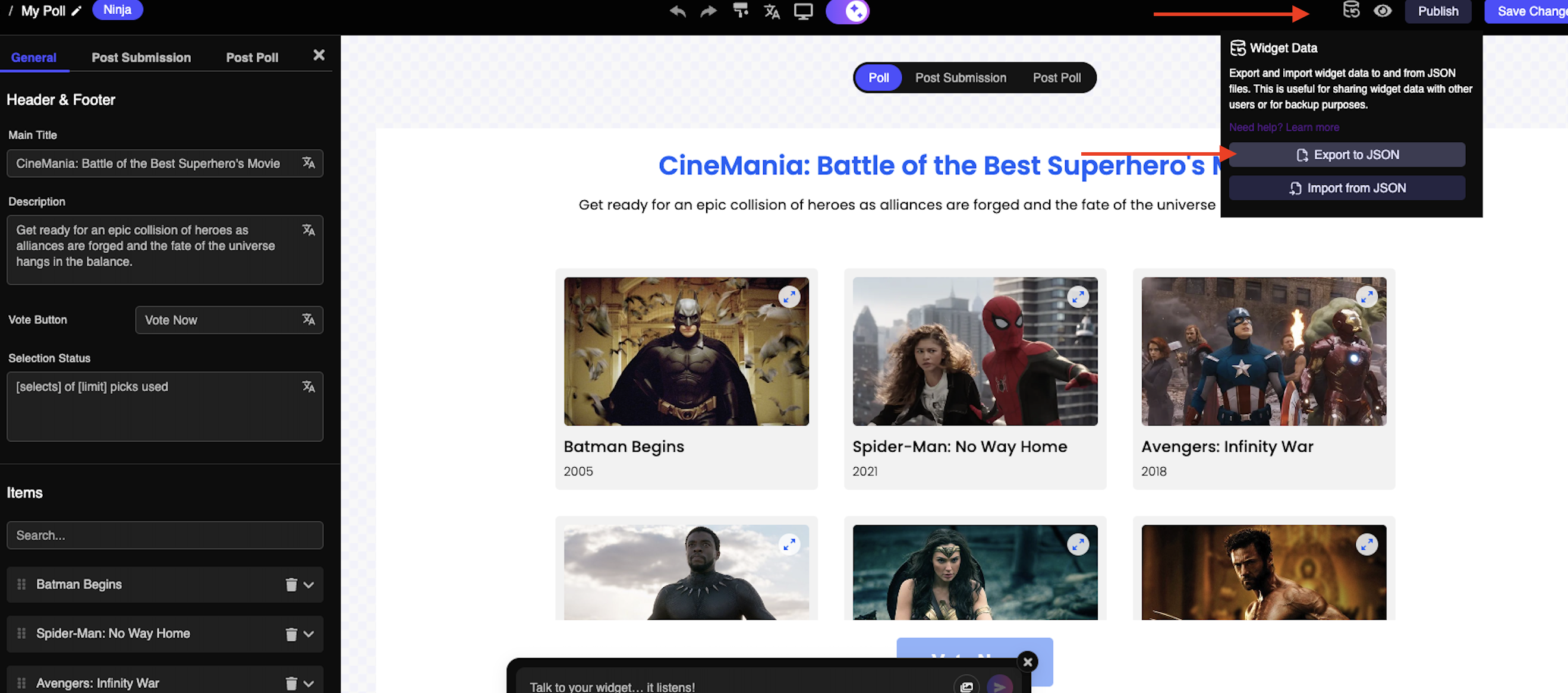 In the Widget Data panel, locate the Export to JSON button. Clicking this button will start the export process. This action is critical as it prepares your data for download in a JSON format, making it ready to be used in other applications.