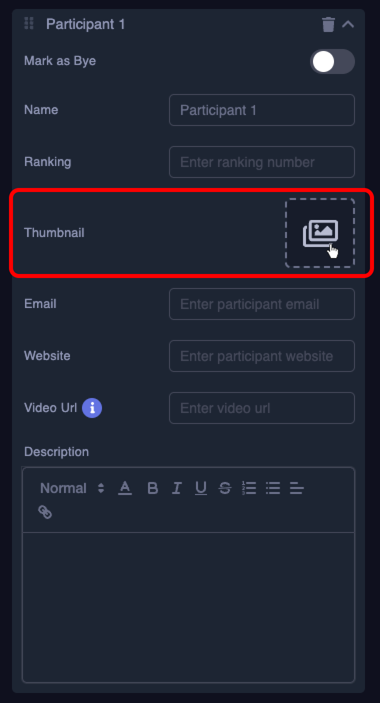 - Once an image has been uploaded, it will be prominently displayed on the respective participant within the game bracket and on their participant card.