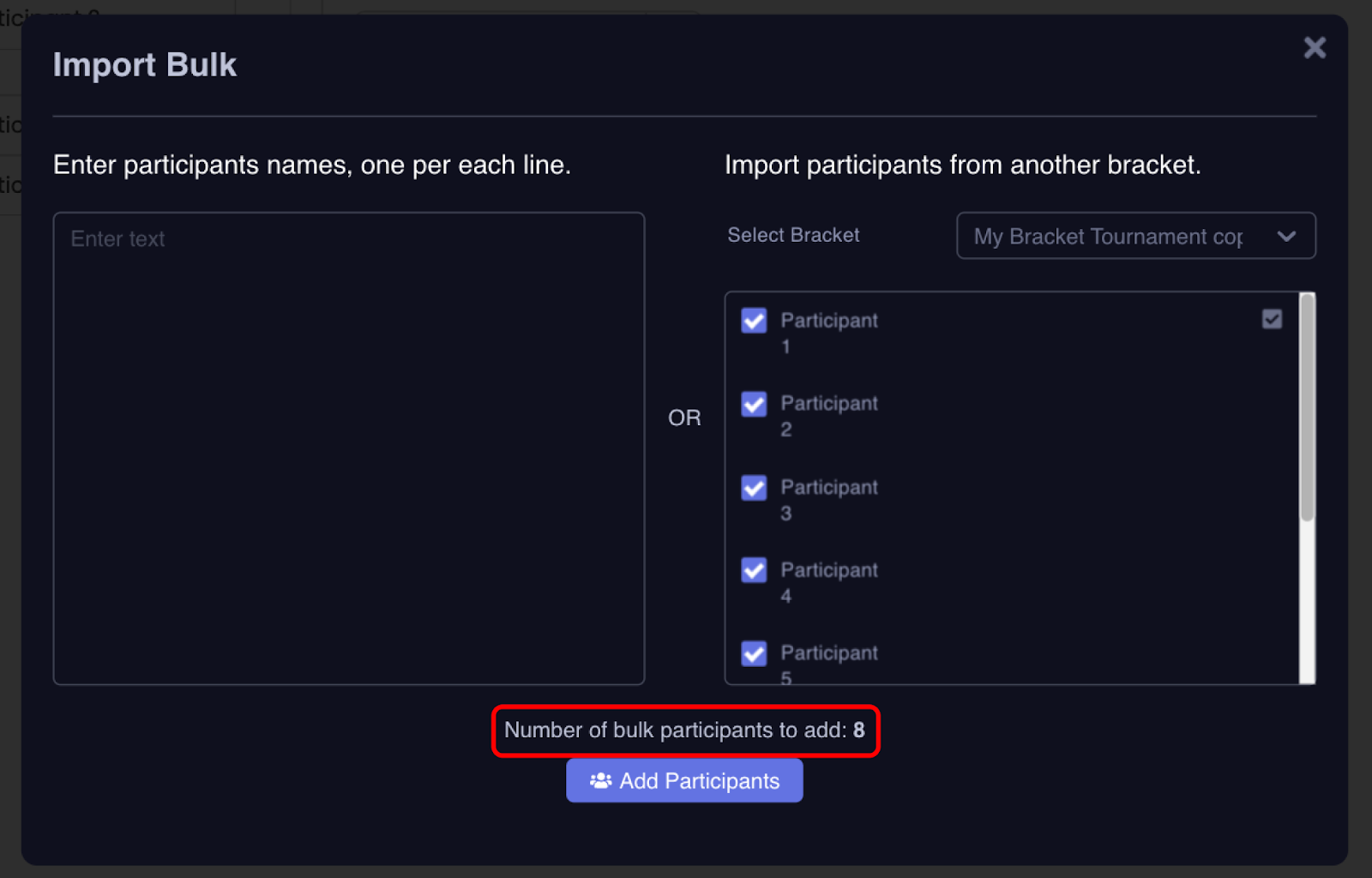 - Once you are done adding all participants, the popup window will display the number of participants you're about to add. In the example, we've selected all 8 participants from another bracket.