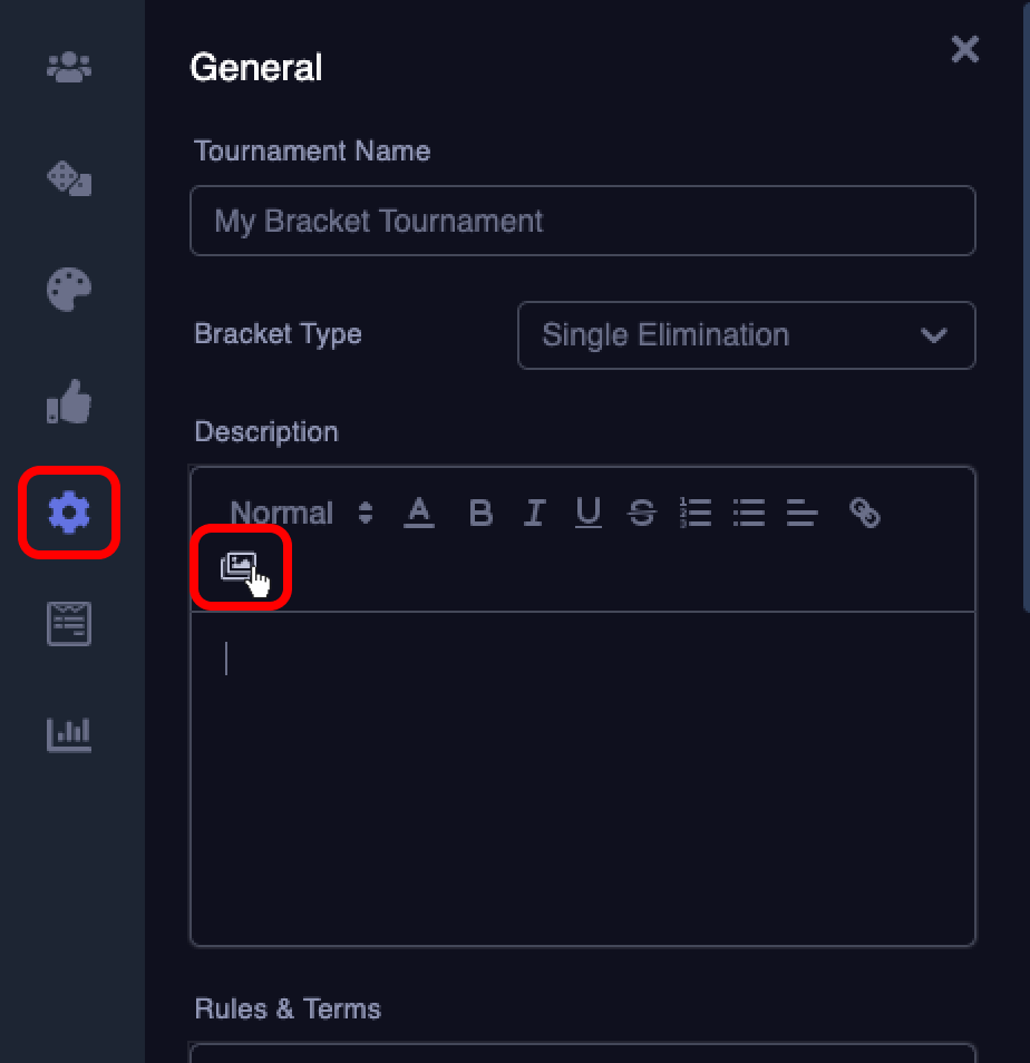 - In your widget editor, navigate to the Settings section and locate the Description tab. Click on the image icon: