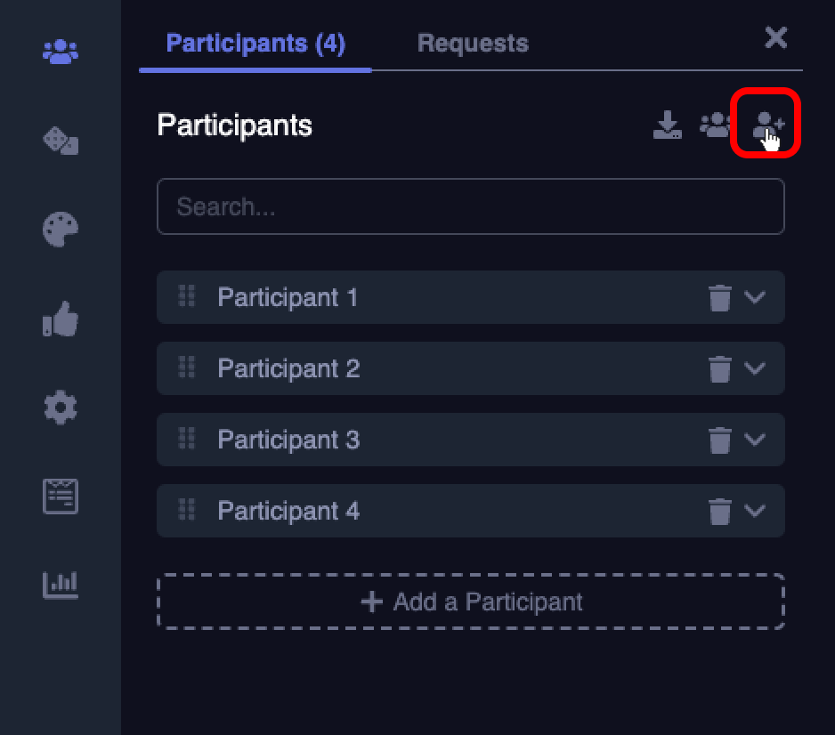 - Alternatively, participants can be added by selecting the Add Participant icon positioned at the top right corner of the Participants section.