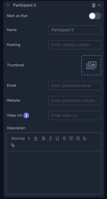 Participants encompass all individuals involved in any given tournament, whether they are identified as Players or Teams. There are three distinct methods for incorporating participants into the tournament brackets: