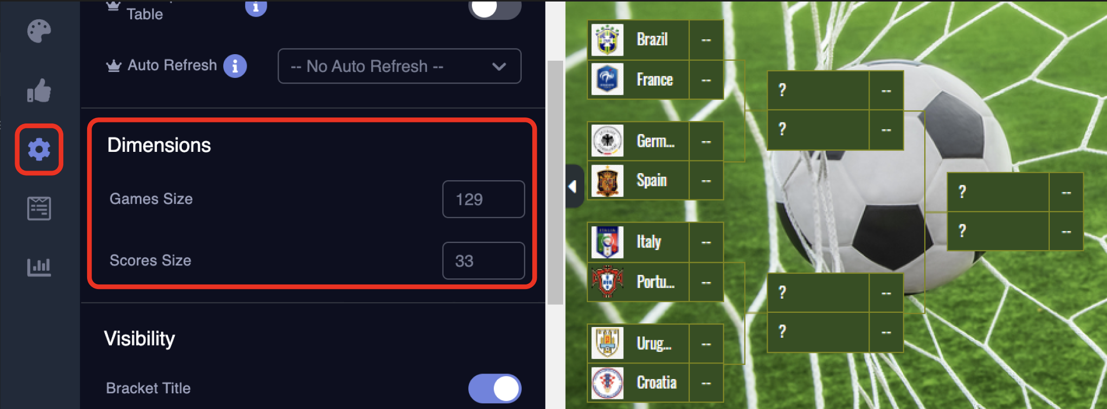 - From the brackets editor, access the Settings tab. Scroll down to find the Dimensions section, where you'll see two options: Games Size and Scores Size. An issue often arises when participant names, such as Germany, Uruguay, and Portugal, get truncated within the brackets, affecting the visual coherence. This is precisely where the Games Size feature becomes invaluable in addressing such concerns.