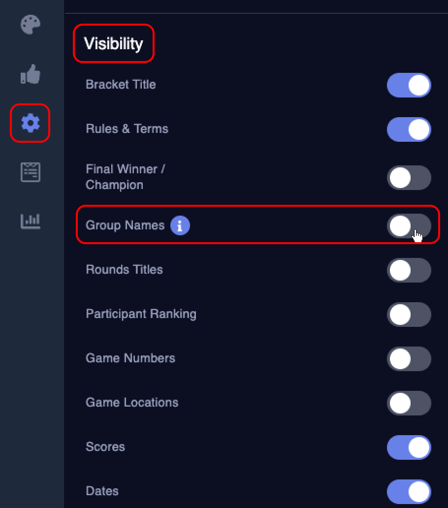 When you have 16 or more participants added to a March Madness bracket widget, you can access a feature called Group Names. When turned on, the corresponding group names for each round title will display.