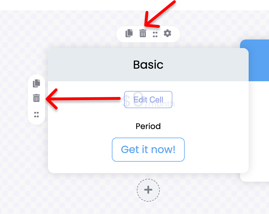 From your widget editor, move your mouse cursor on any pricing plan or cell you want to delete. You’ll now see the trash icon at the top and left side of the pricing plan. To delete the cell, click on the trash icon on the left side, and to delete the pricing plan, click on the trash icon on the right side.