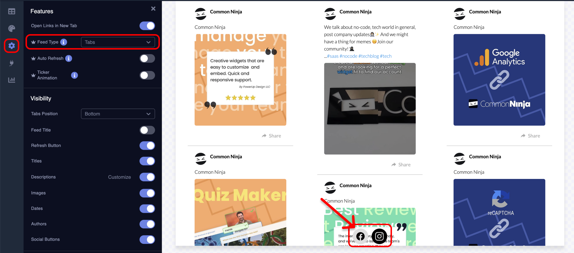 - In your editor, select the Settings tab. Under Features, you will see Feed Type. By default, the Tabs option is selected. With this option, there are several tabs visible at the bottom of the feed, each corresponding to a specific social media feed