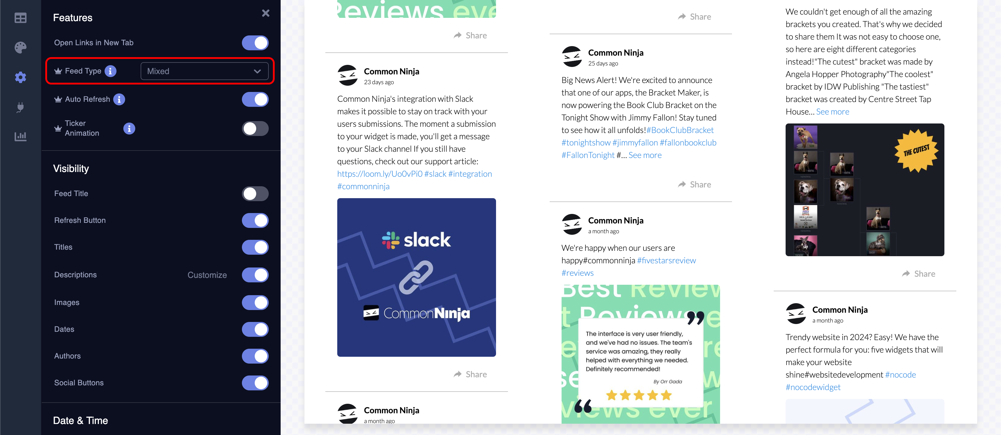 In the "Mixed" setting, every social media account is displayed based on how they are added as feed sources, with the feed ordered according to the publication date of each item.