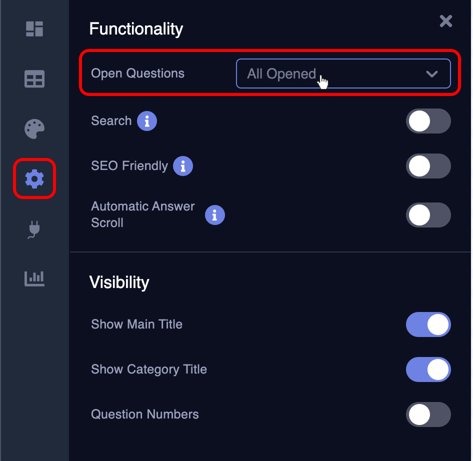 You can customize the opening behavior of your questions according to your preferences. Whether you prefer them opening individually, one at a time, with others closing automatically, or as a group where multiple questions can be open simultaneously, or even have all questions open at all times, you can easily adjust these settings.