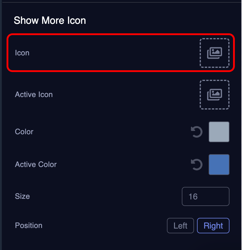 If you'd like to utilize our advanced styling options and give the "Show More" icon a unique appearance instead of the default arrow, you can easily achieve this through the following steps: