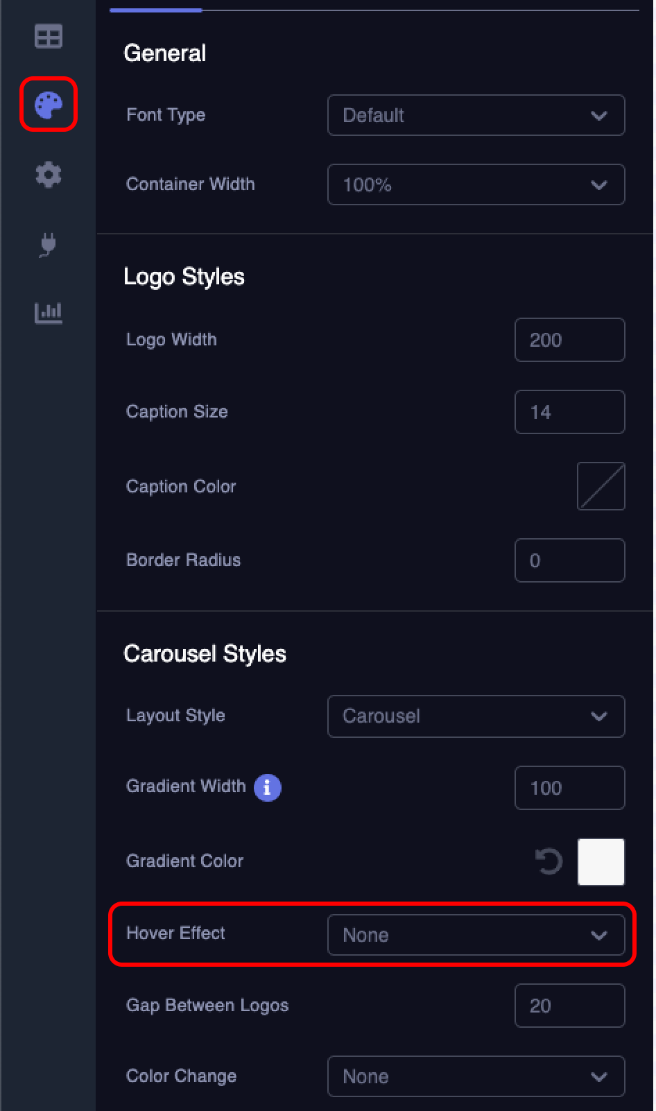 You can add a hover effect to the carousel layout of the Logo Showcase. To do so, go to “Look & Feel”, then, under the "Carousel Styles” section, click on the “Hover Effect” option to choose your preferred hover effect.