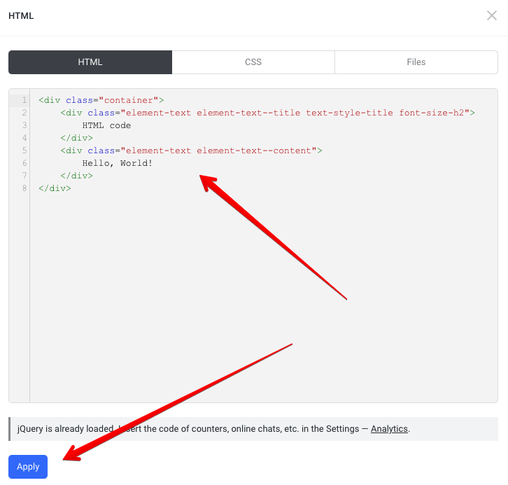 5. Now, in the window that opened up, delete the text that’s there, and paste the code you’ve copied before. Click “Apply, and that’s it. You should see Common Ninja’s app instead of the empty HTML widget.