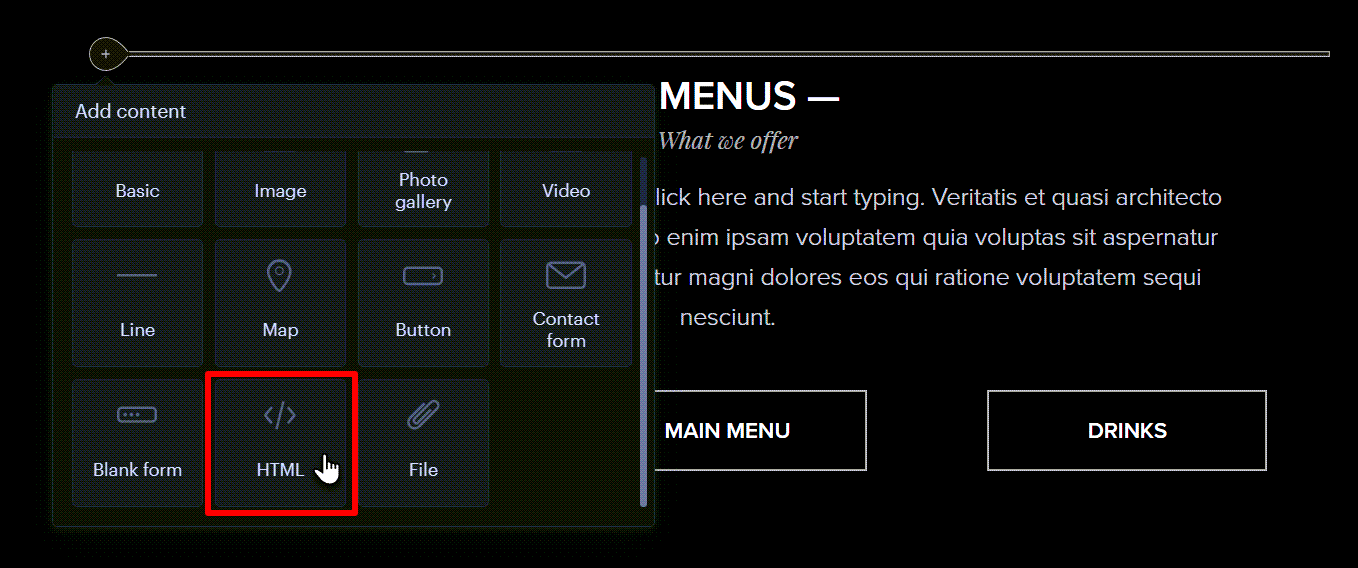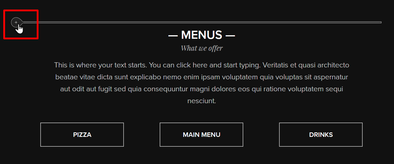 2. When editing a website with Webnode, choose the “+” button next to where you want to add the HTML widget.
