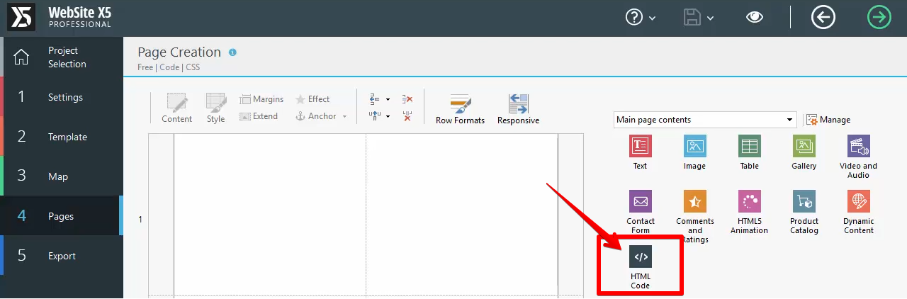 2. Then go to your Website X5’s dashboard, and choose the “Pages” tab. Then, choose the “HTML Code” option, and drag and drop it to the page creation area.