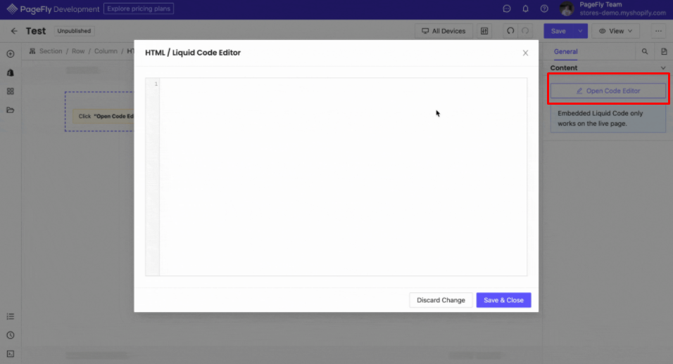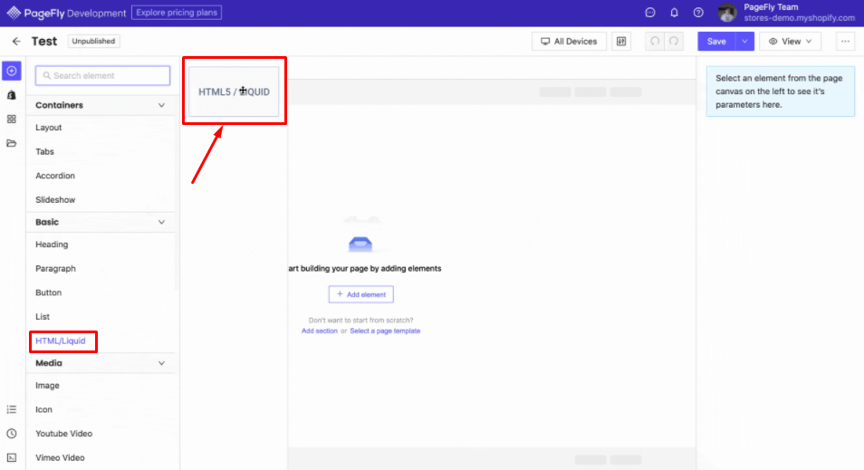 2. On your PageFly dashboard, click on the Plus sign and select the HTML/Liquid element in the dropdown menu.