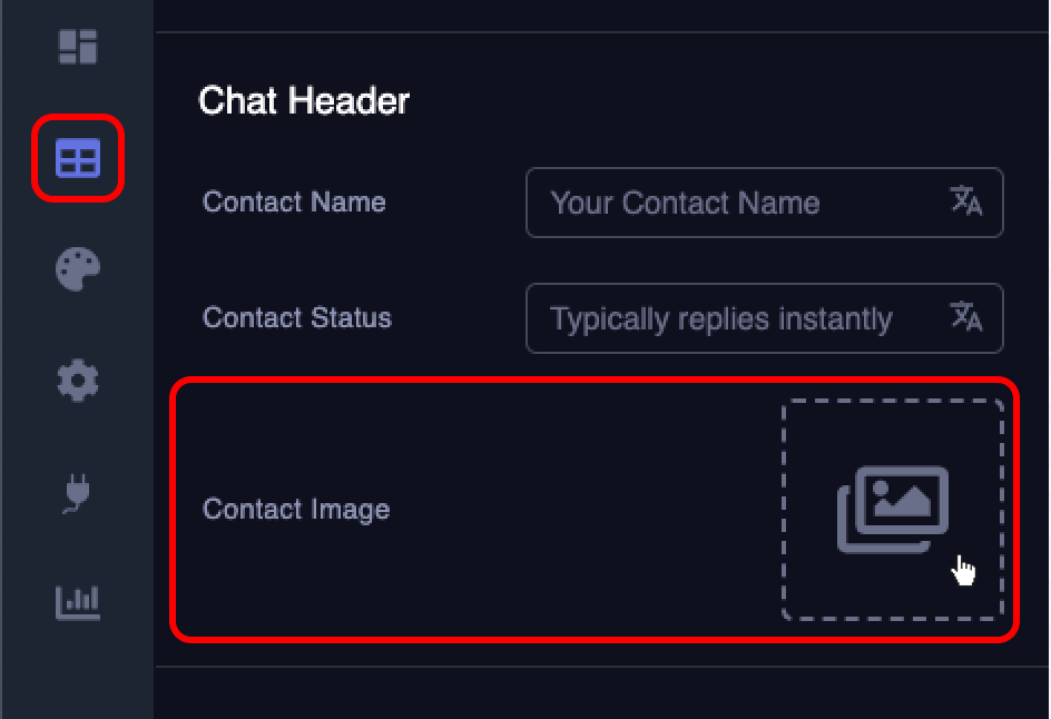 To change the profile picture, you need to select the “Content” tab. Then, under the “Chat Header” category, click on the upload image button next to the “Contact Image” section.