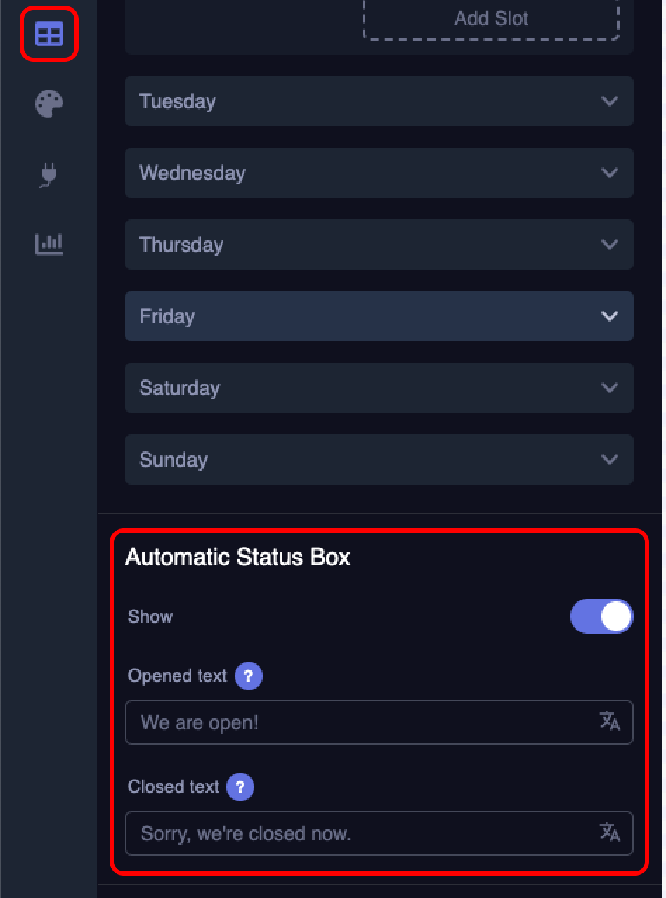 The Status Box feature indicates whether your business is currently open or closed. To enable the Automatic Status Box, go to the "Content" tab. There, under the "Automatic Status Box" section, switch the toggle next to "Active." You can also customize the text displayed for both the open and closed statuses within this section.
