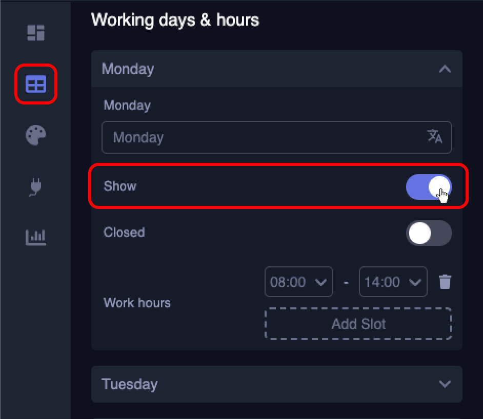 To make a specific day visible, select the desired day from the “Content” tab. Then, in the day’s setting menu, toggle the button on or off, next to the “Show” section.