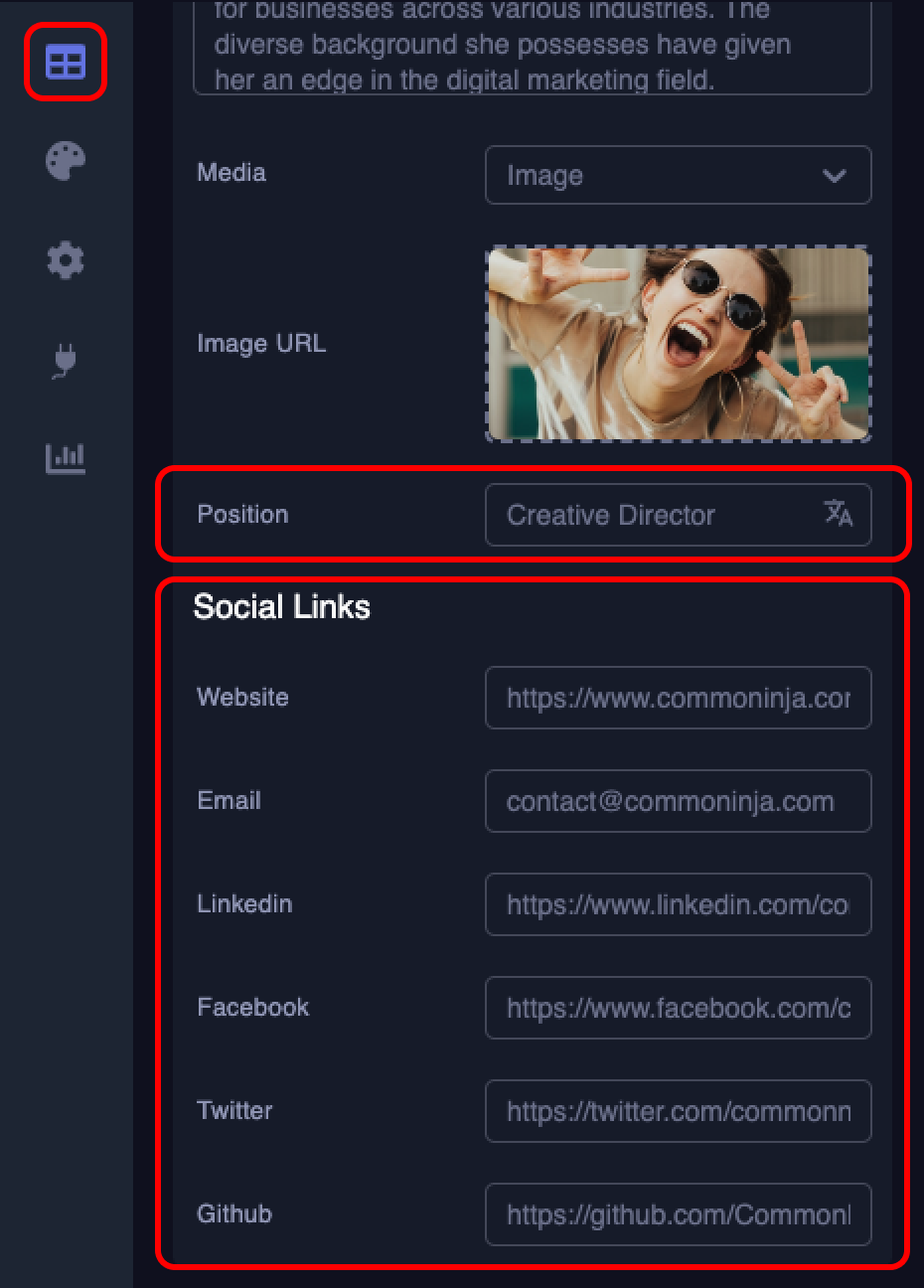 To add a position and relevant social media links, simply go to the list you want to edit under the “Content” tab and add the information in the relevant fields.