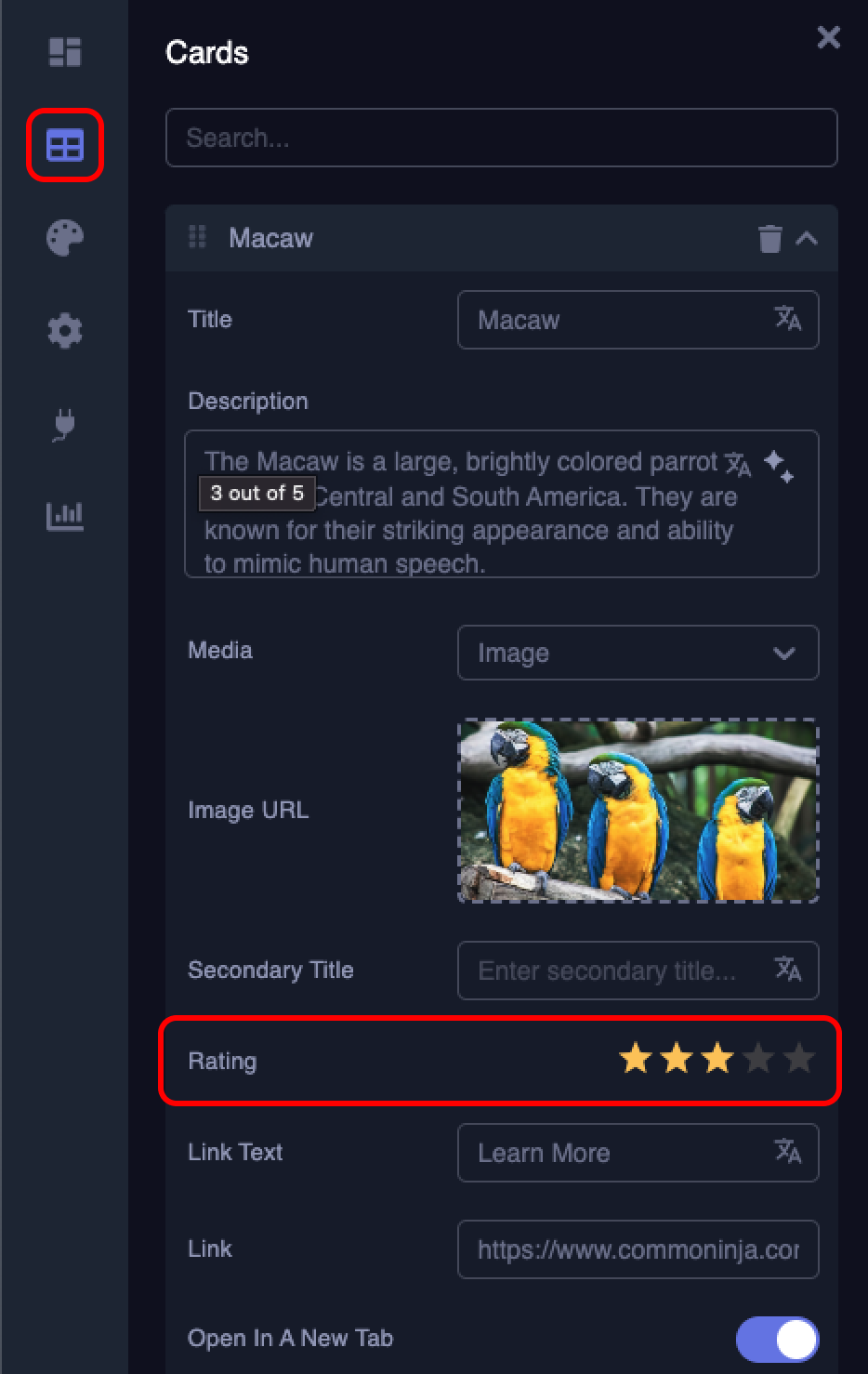 You can change the number of stars in the Flip Cards widget simply by clicking on the “Content” tab, selecting the desired card, and next to the “Rating” section, sliding the ratings to their desired position.