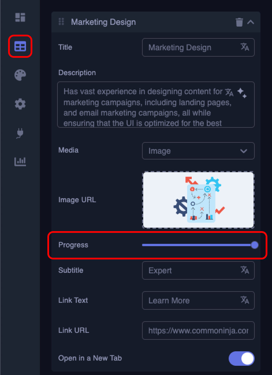 You can easily customize the length of the progress bar in each card by going to the “Content” tab, selecting the desired card, and changing the progress bar by sliding the available slider next to the “Progress” section.