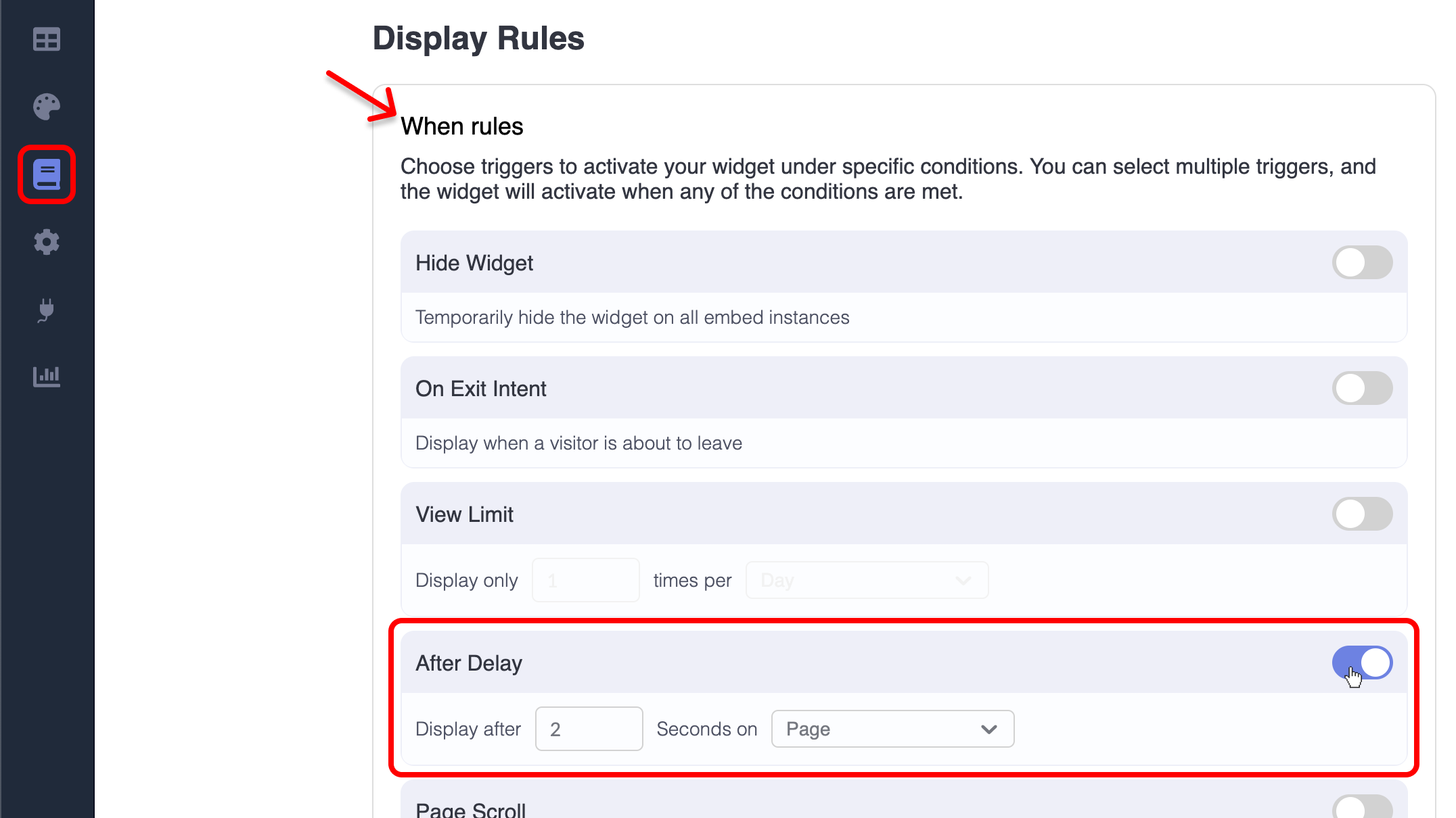 The "After Delay" trigger allows you to display the widget after a specific period of time has passed.