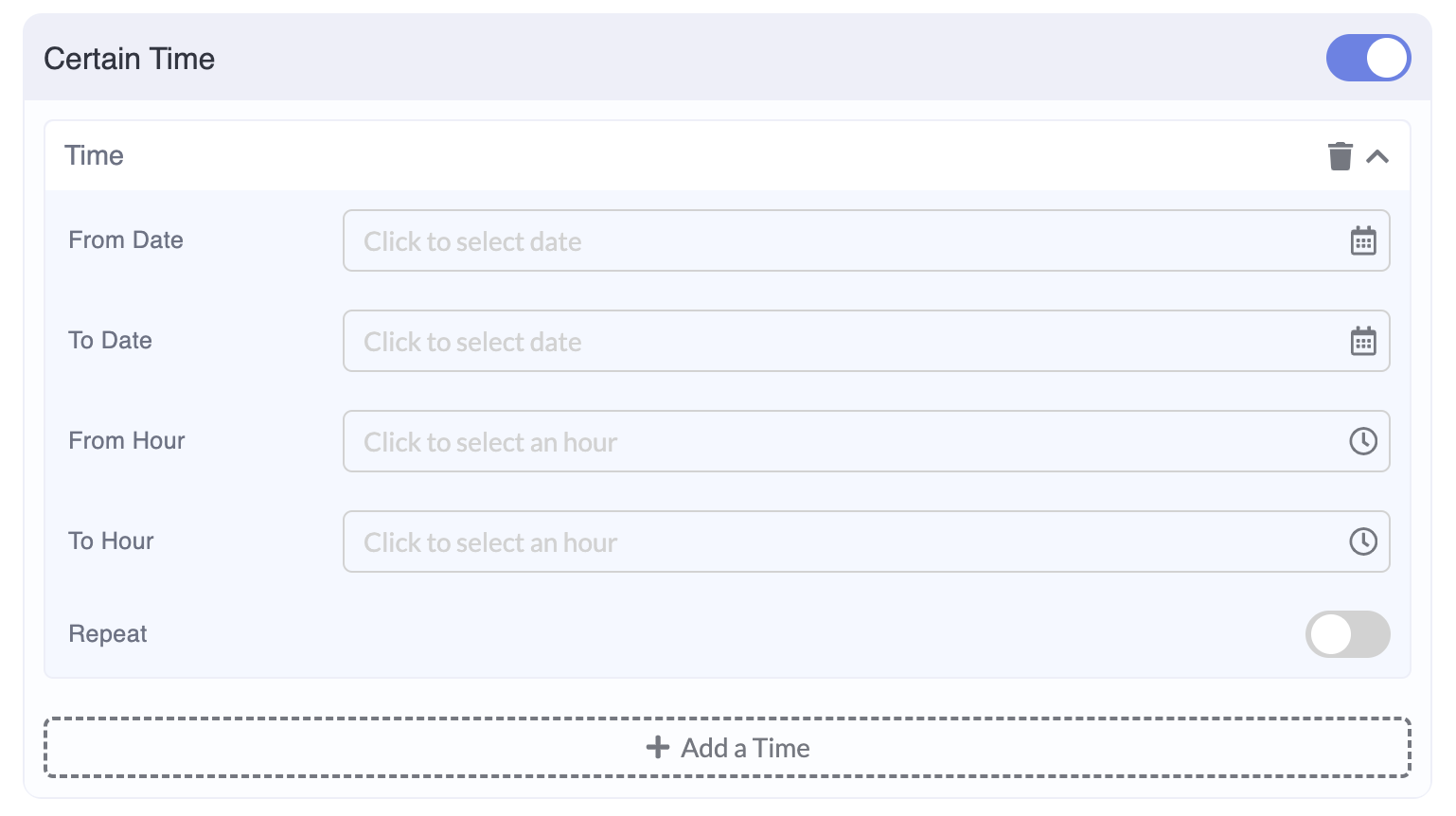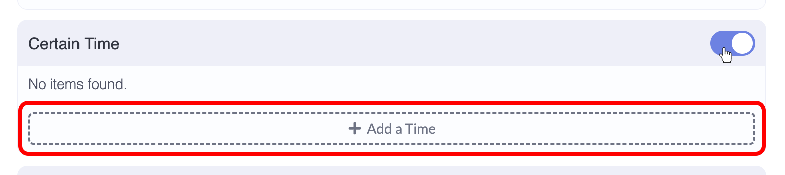 2. In the opened section, switch on the "Certain Time" option. Then, click on the "+ Add a Time" button.