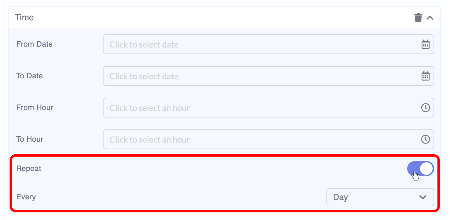 4. To make this action repeat, toggle the "Repeated" option. You can choose the frequency, such as daily, weekly, monthly, or yearly.