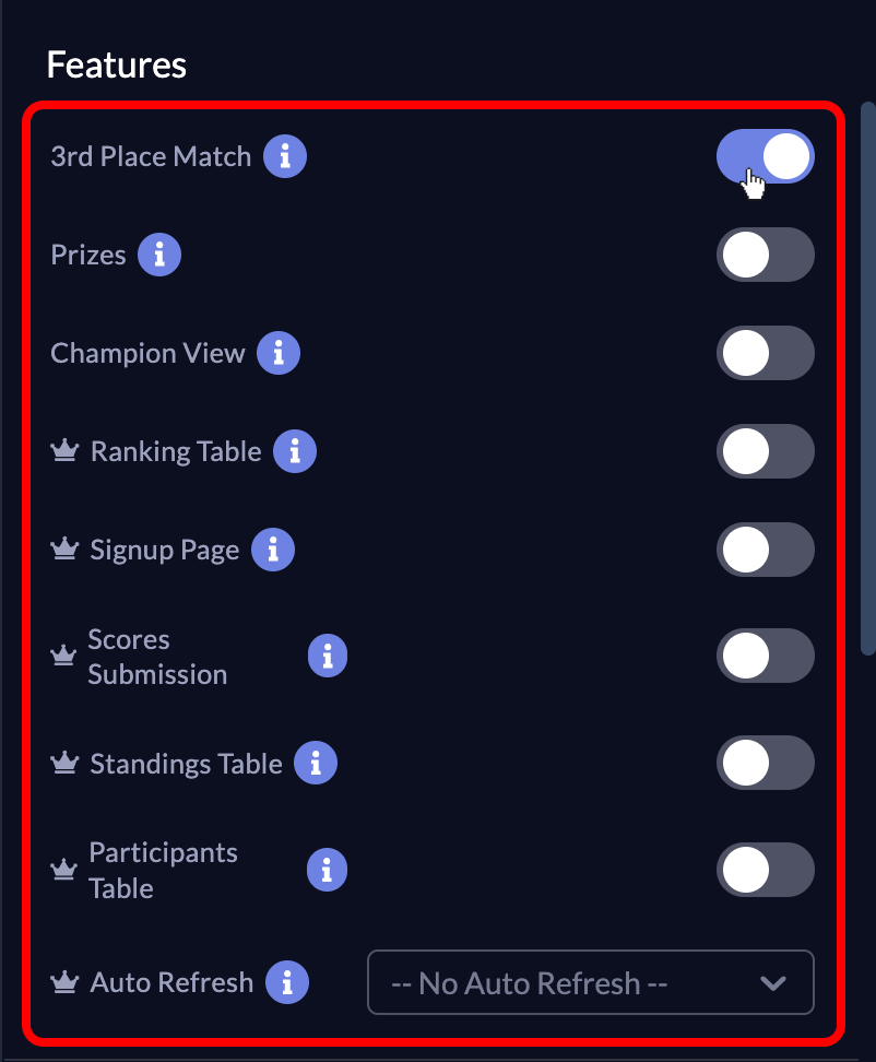 Enhance your experience with your bracket by exploring its additional features such as a 3rd-place match, prizes, champion view, and more. Easily customize your preferences using the bracket editor: