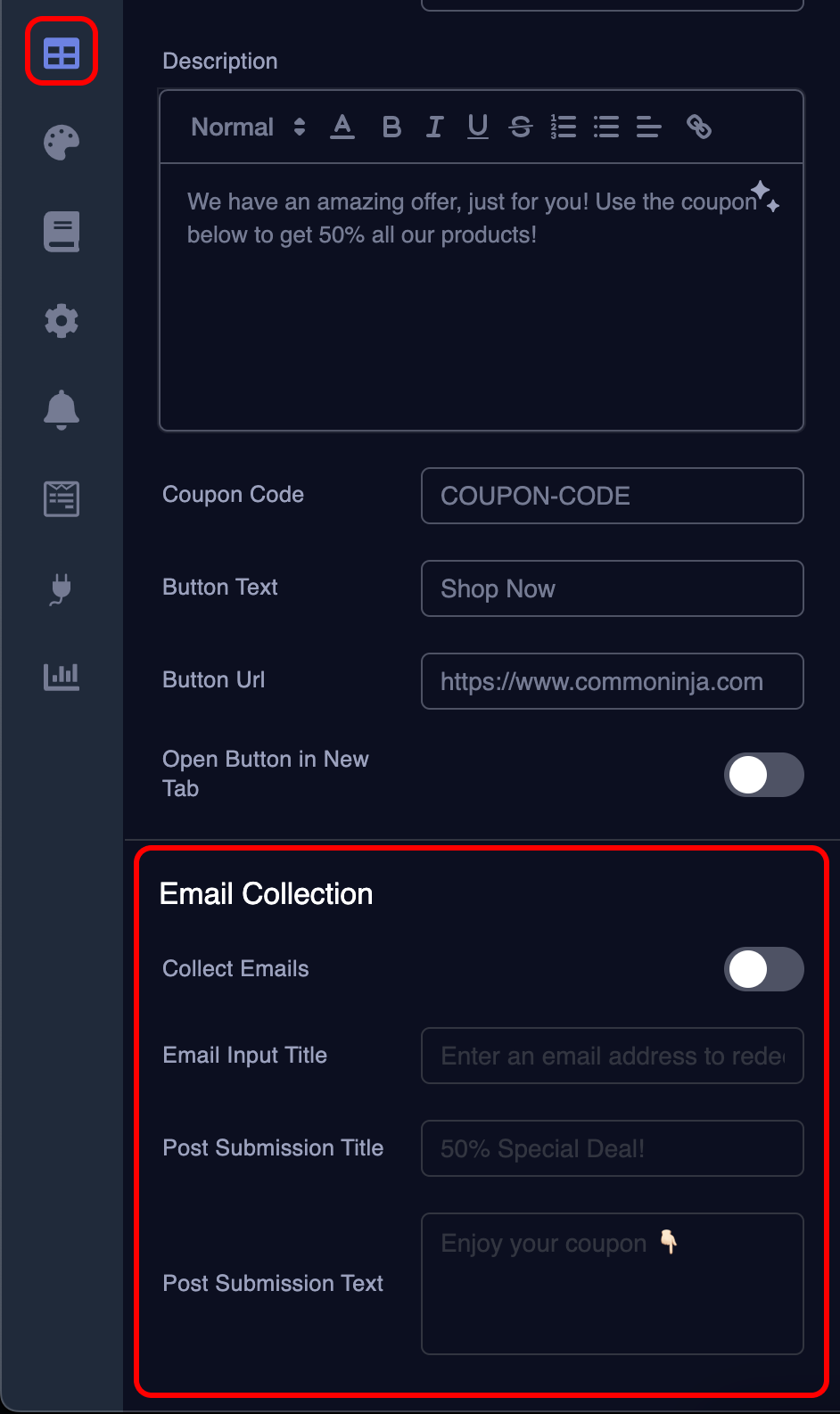 You can toggle email collection and & edit its setting by clicking on the “Content” tab and editing the relevant options under the “Email Collection” category.