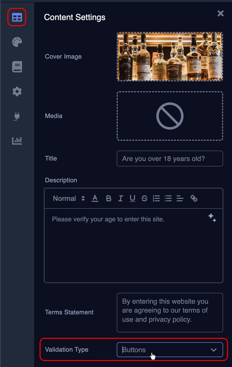 To change the validation type, go to the “Content” tab. Under the “Content Settings” category, locate the "Validation Type" setting, and choose your desired validation type.