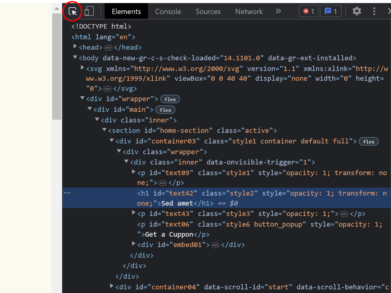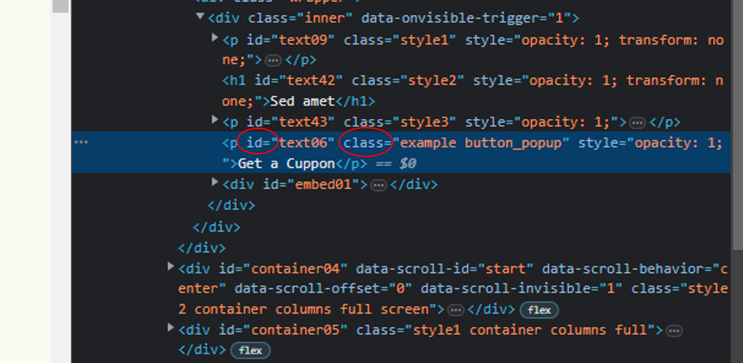 - Search through the highlighted lines for the word "id" or "class". These are the identifiers that help you locate the specific element on the page.