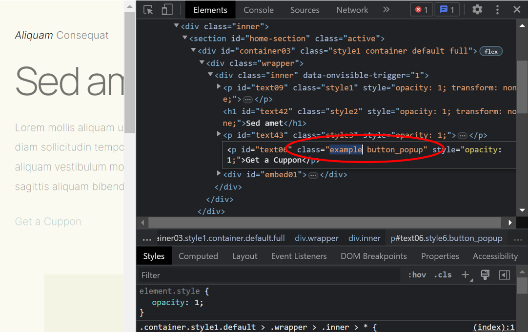 - class: If you copied the text, for example, "class_example", paste this text in the "Selector" field and add a dot (.) to the beginning.