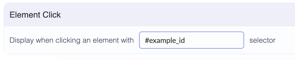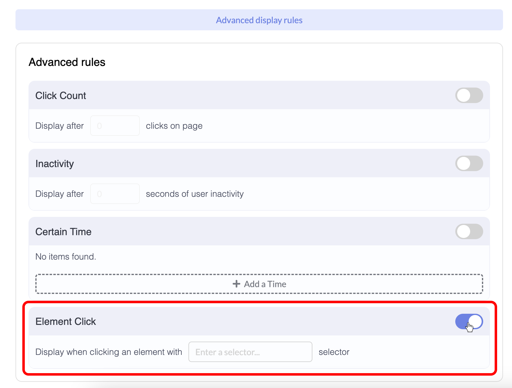 In the opened section, toggle the “Element Click” on, where you will see a “Enter a selector” option.